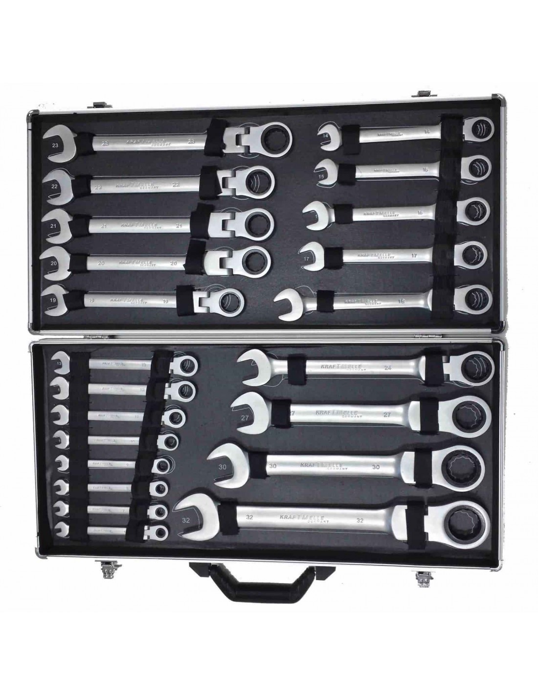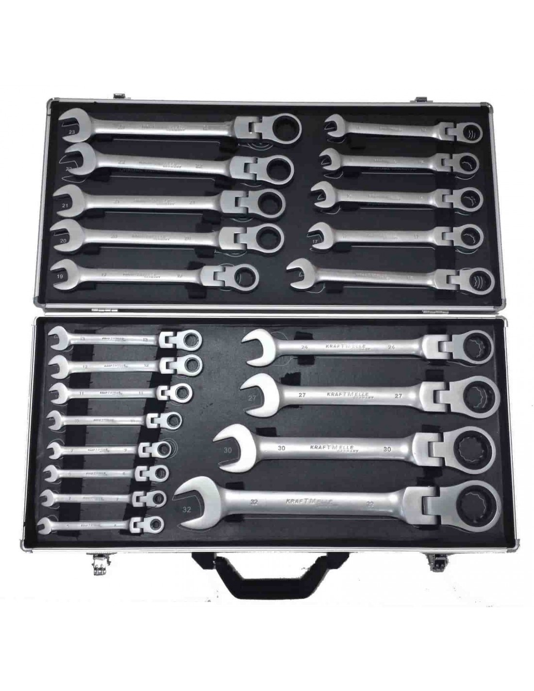 Maletín de llaves de carraca articulables. 22 llaves de diferentes medidas:  6mm, 7mm, 8mm, 9mm, 10mm, 11mm, 12mm, 13mm, 14mm, 15mm, 16mm, 17mm, 18mm, 19mm, 20mm, 21mm, 22mm, 23mm, 24mm, 27mm, 30mm, 32mm.