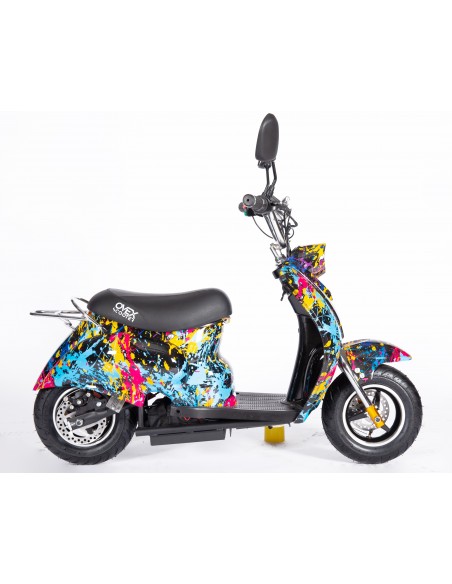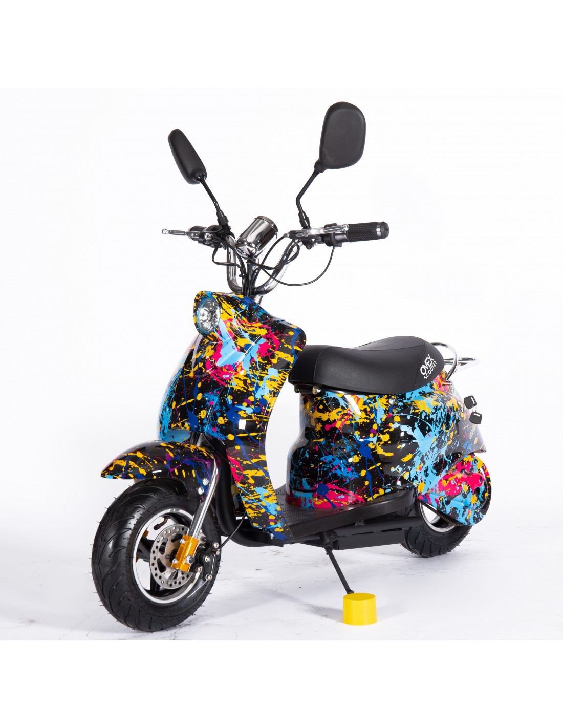 Vespa para niños marca OVEX con llantas de 6,5" y con neumáticos de asfalto y frenos de disco.