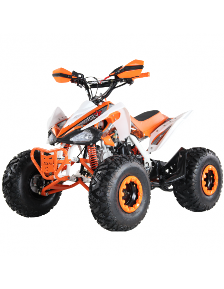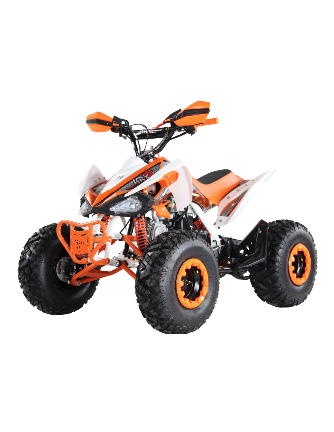 Cuenta con ruedas robustas de 8" para mayor adherencia al terreno que incluyen embellecedores de color rosa o naranja. Sistema de amortiguación delantera y trasera para mayor absorción de impactos. Además, dispone de parachoques delantero y cubremanos. Quad de líneas deportivas.