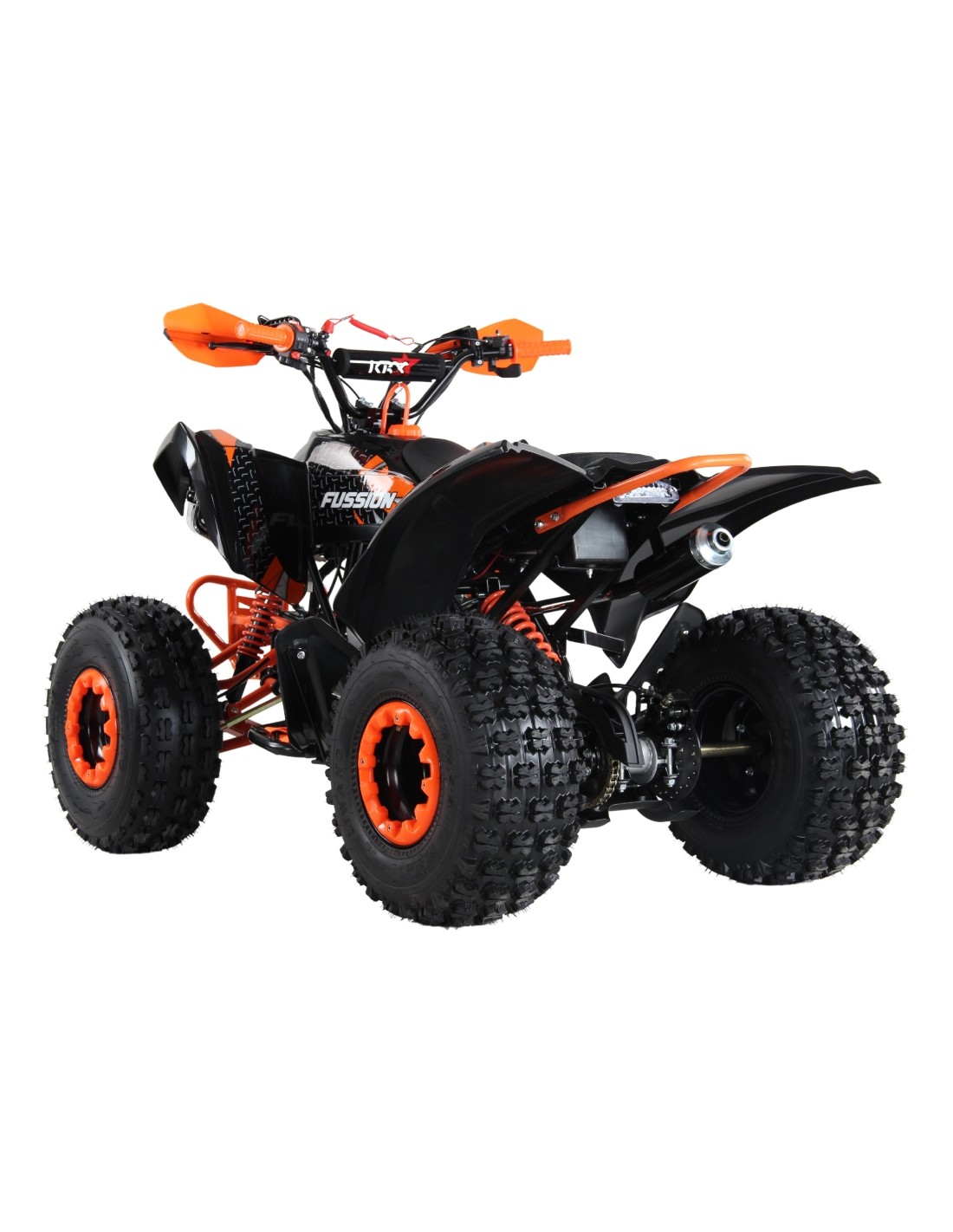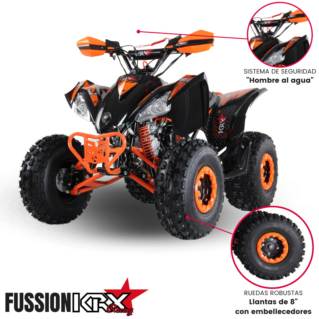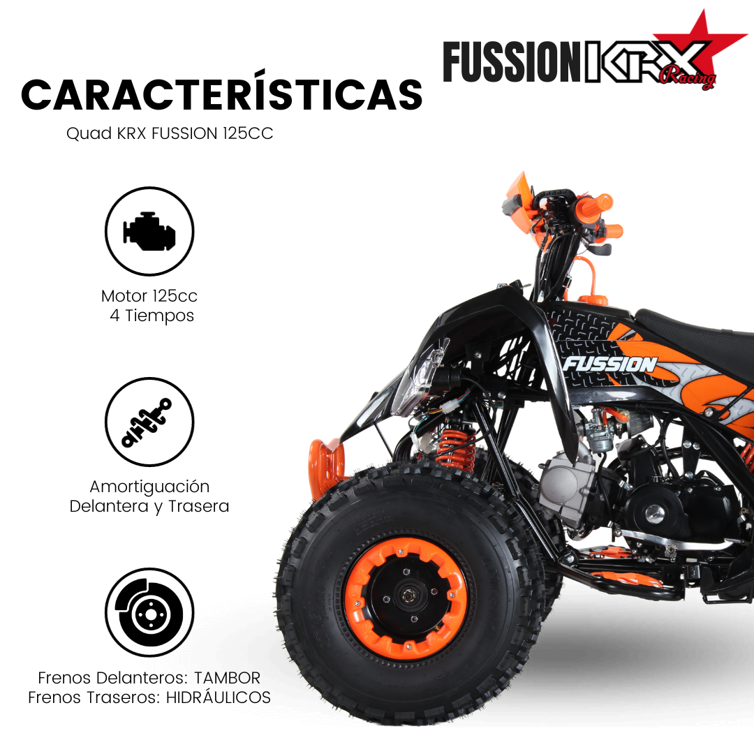 Desafía cualquier terreno con el nuevo FUSSION, lo último de KRX en quads de 125cc. Equipado con un motor de 4 tiempos, este potente quad está fabricado para disfrutar al máximo de su conducción. Explora el mundo con este quad robusto, de grandes dimensiones, con cubremanos y defensas, y una estética de lo más llamativa.