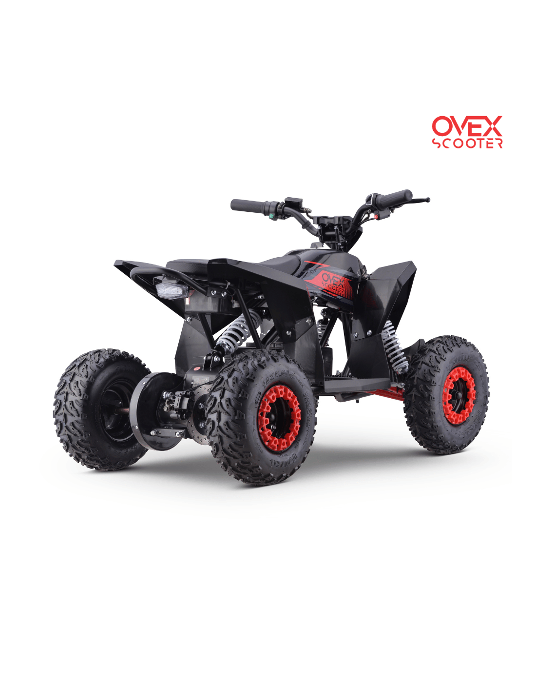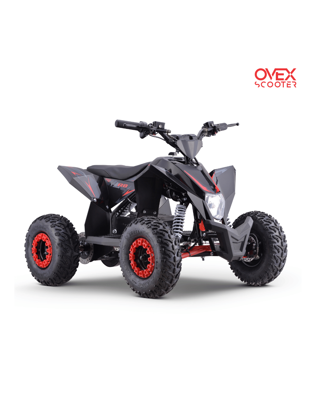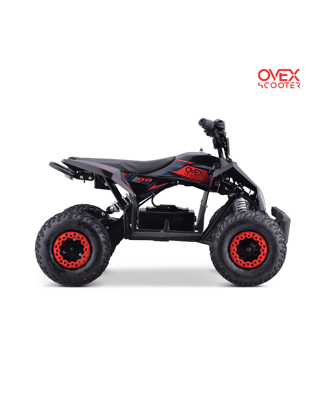 Mini quad eléctrico OVEX R8 PRO MAX equipado con triple amortiguación para una mayor absorción de impactos. Monta sobre llantas de 6" y neumáticos de taco para un mayor agarre ante los terrenos más dificultosos.